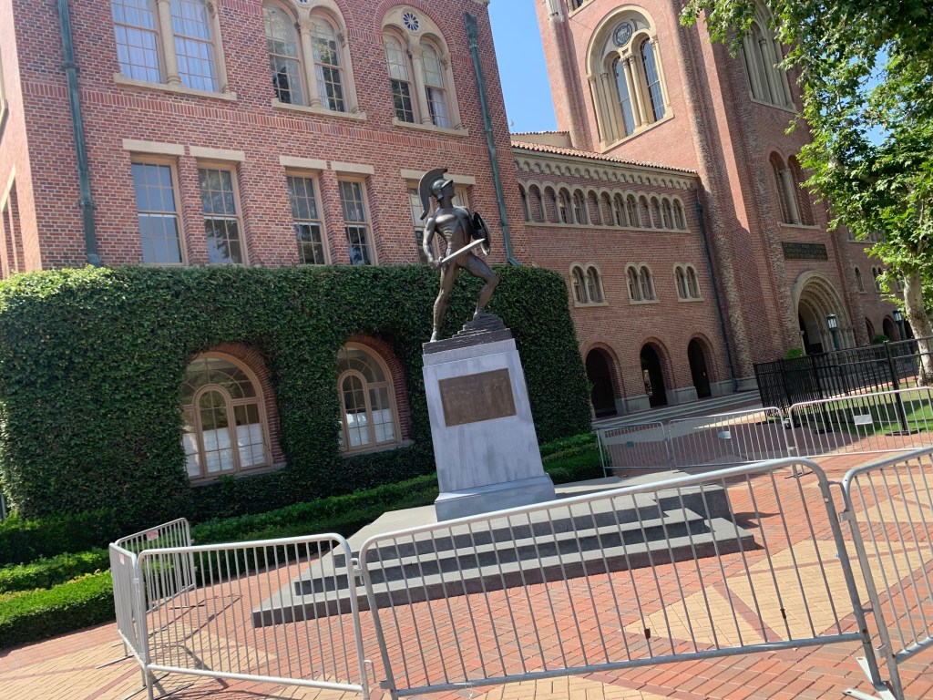 Outside of the classroom, I enjoyed taking long walks around the USC campus, the entire campus is very beautiful. There is lots of greenery, statues, and buildings, my favorite building is probably the USC Marshall building. I took some pictures of Tommy Trojan, another statue at the quad, and a sticker I bought from the USC Bookstore.