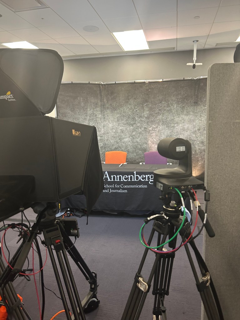 In Professor Allan Lopez’s class, we’ve been more hands-on with broadcast journalism this week rather than the usual lectures surrounding it. We spent a lot of time in Annenberg’s studios—first, on Tuesday, we recorded an introduction to our Vox Pop assignment in the podcasting rooms. Sitting in the room with two other classmates, on the table before us lay a headset for each of us as well as a microphone. We placed the headphones on our ears as we gushed about how we sounded like we were actively listening to ourselves in an already-created podcast as we spoke into the microphone. Stunned, we realized we could also see ourselves on a screen on the wall and took lots of pictures before returning to the lounge area where I made a plethora of new friends that day.