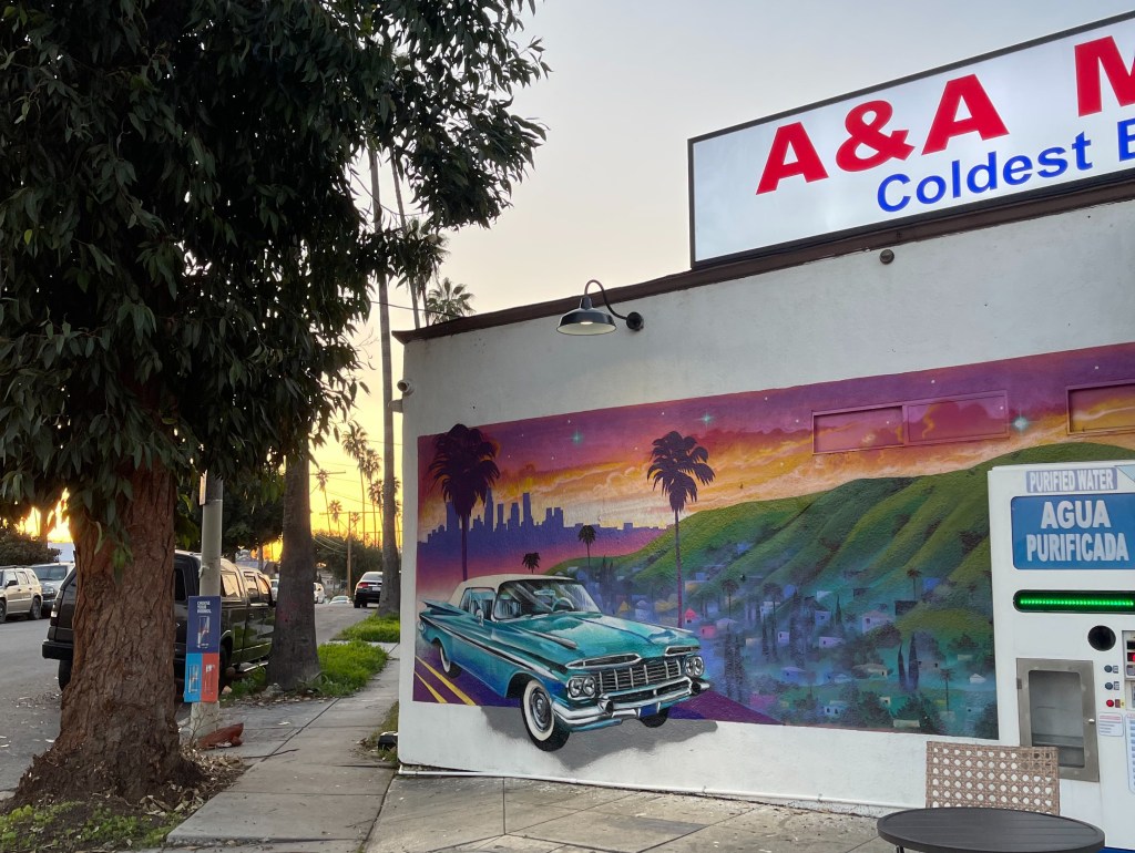 As the sun sets in El Sereno, the vibrant mural on the side of A&A Market captures the spirit of the community. The artwork features a classic car cruising through a colorful landscape, with palm trees and a city skyline in the background. The market shows signs of age, and its long-standing presence in the neighborhood. A&A Market remains a beloved spot for locals, offering the “Coldest Beer.”