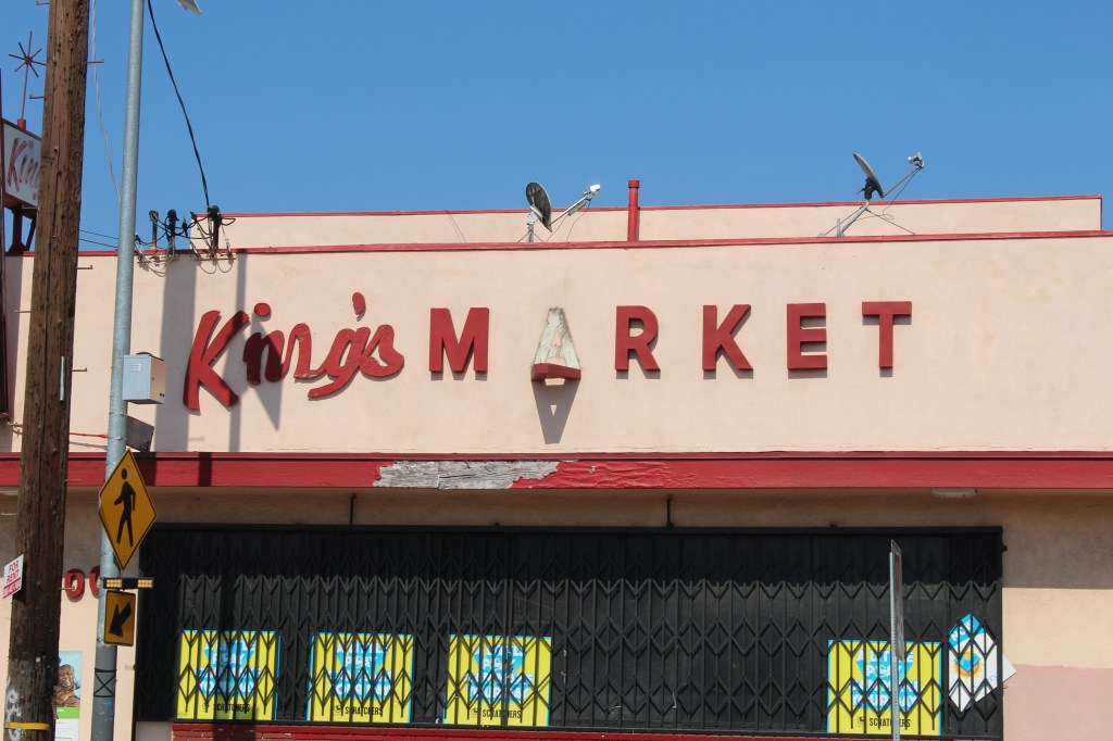 King’s Market sign. This market is a staple in the neighborhood, and like most stores, the quality of the building is declining. The sign itself is weathered and fading, a symbol of the neglect that has befallen the once-vibrant market. It’s disheartening to see the gradual decay of a place that holds so many fond memories for many people. The shopkeepers don’t have the money for the necessary repairs, so its condition is only going to worsen.