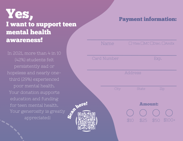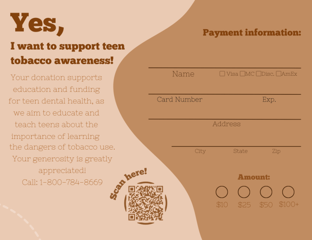 Finally, it’s important to discuss what statistics or quotes we used exactly. One of the first quotes we used was, “Overall, nearly 57% of adolescents 12 to 19 years have had dental cavities in their permanent teeth,” from the National Institute of Dental and Craniofacial Research. We decided to implement this quote into our pledge cards because it encompassed how more than half of adolescents already have serious issues with their dental health. Citing this alarming finding on our dental health pledge card was a great way to capture attention, while still informing our audience of the issue. Another statistic we used regarded teen tobacco use, “Every day, almost 2,500 children under 18 years of age try their first cigarette,” which was from the American Lung Association. Again, when conducting our research we found this rate to be shocking, but that is why it works so well. We can only fit so much information onto a pledge card, so using short, revealing data was imperative. Lastly, for our mental health pledge card we used, “ In 2021, more than 4 in 10 (42%) students felt persistently sad or hopeless and nearly one-third (29%) experienced poor mental health,” from the CDC. This data is relatively recent and provides a descriptive perspective on the percentage of teens suffering from poor mental health, which is why we decided to use it.