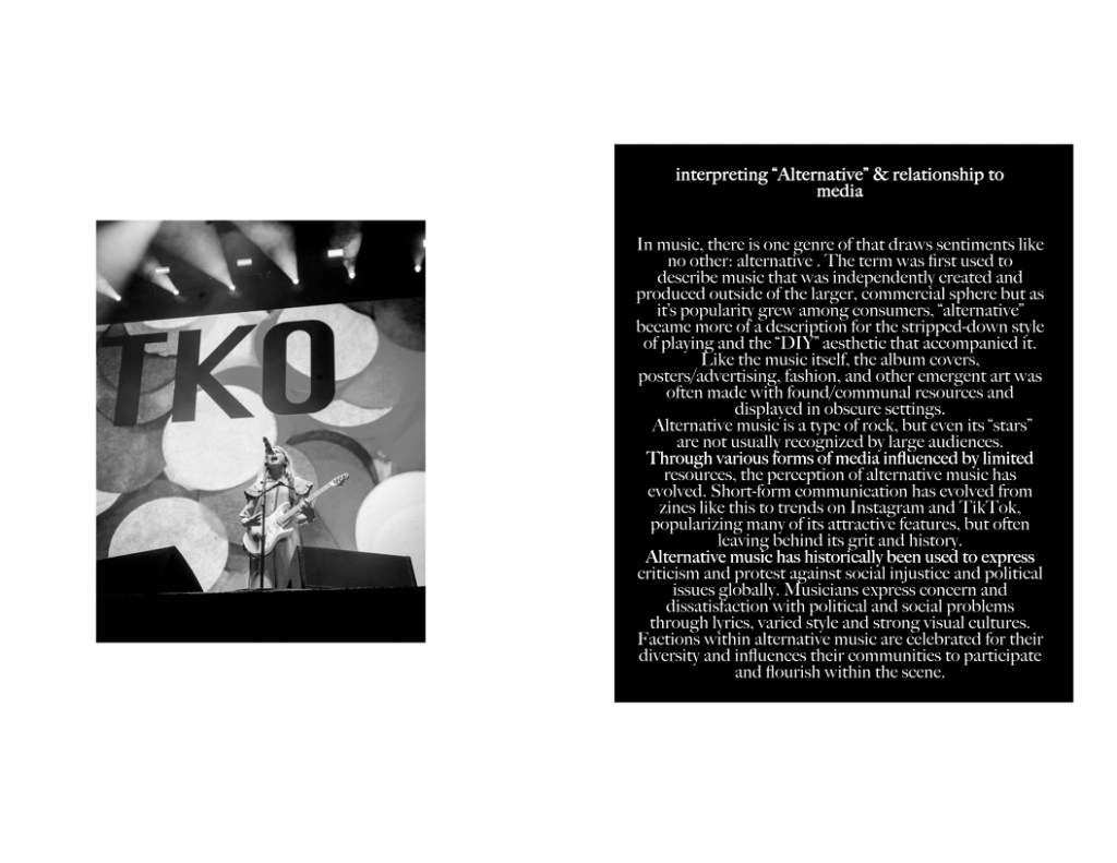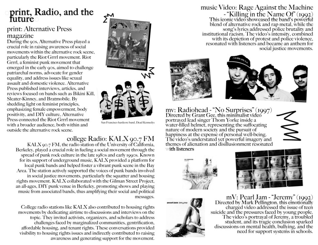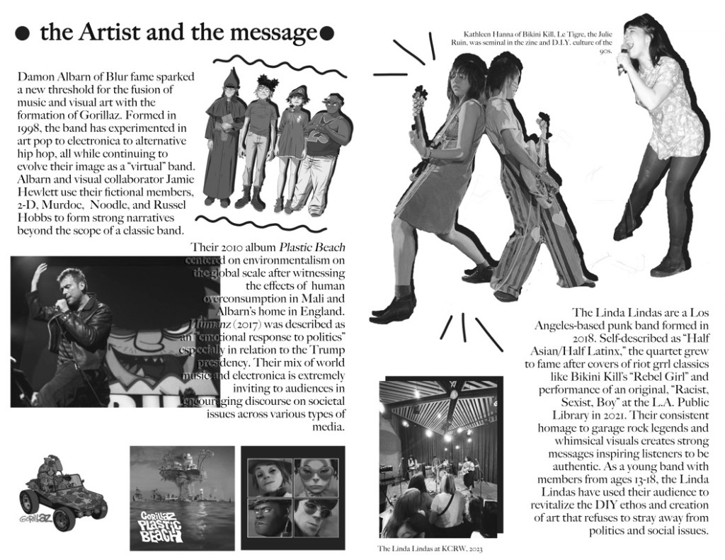 This topic has influenced music and different forms of media today. Compared with the early hip hop movement, kids were transported to a place away from societal pressures and organizations. Teens in the middle of Seattle’s suburbs felt like they could be a part of something more, connecting cross-culturally with a common interest. Now, the movement perseveres, and new forms of youth culture are being molded every day. In this zine, we explored the specific impacts of the media in spreading these messages, as well as instances where bands directly spoke out. Through three separate spreads, we talked about bands like The Linda Lindas who spoke out against racism, and concerts like Lollapalooza where bands engaged in politics with their audiences. We used Adobe’s software Photoshop and InDesign to create collages and craft page structures. By examining these themes, we ask how these movements can progress in the modern age of Spotify.